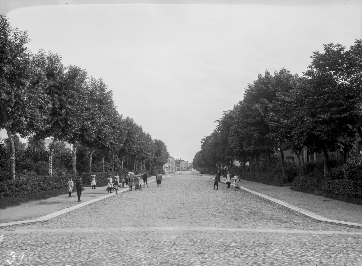 Pilgatan mot söder från Brunnsgatan i Jönköping. Till vänster ligger nuvarande Västra torget och till höger skymtar tändsticksfabrikens arbetarbostäder bakom träden.
