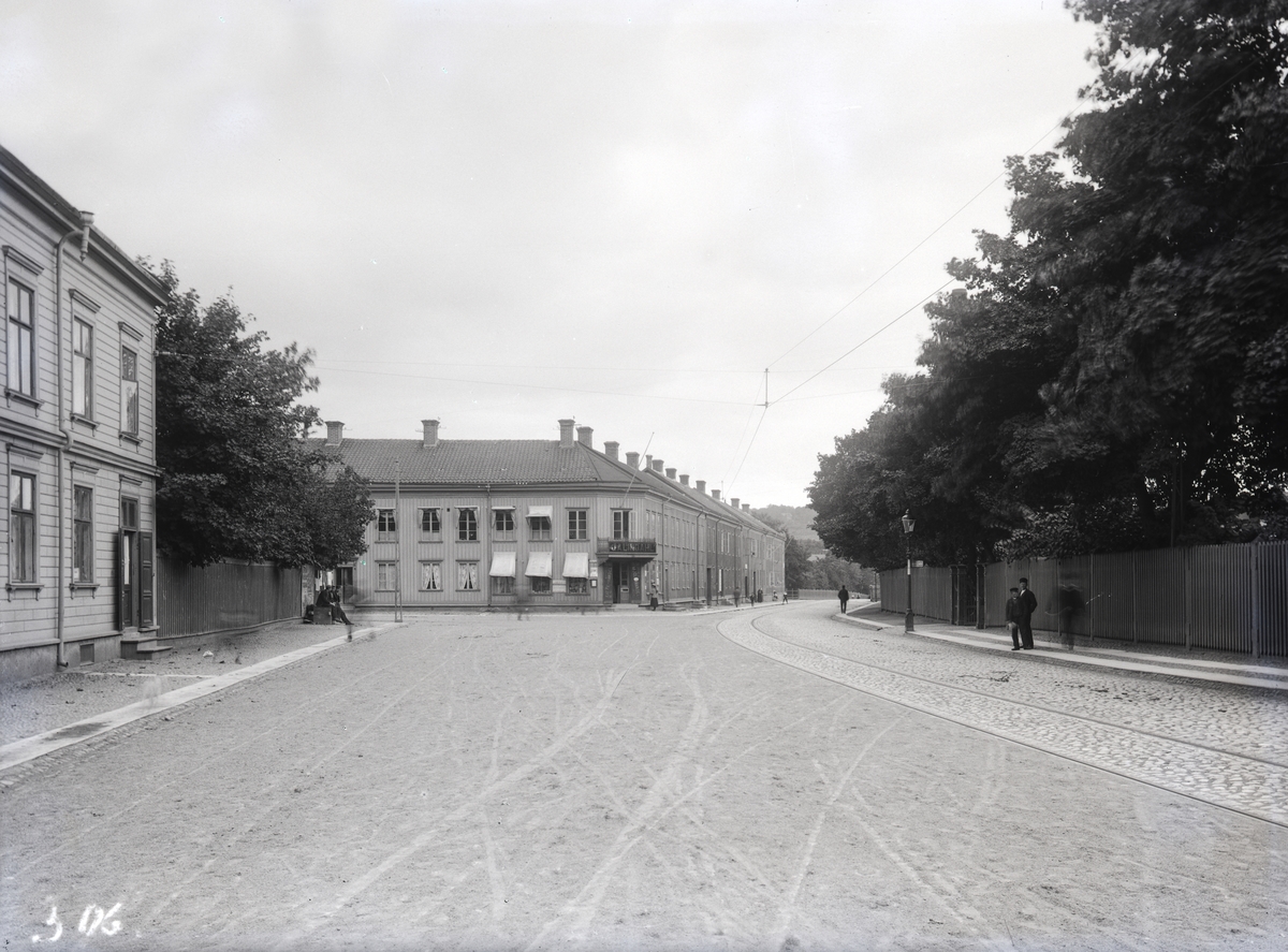 I fonden Västra Storgatan 27 och Kapellgatan 2 i Jönköping. Det ägdes av H. Halls Boktryckeriaktiebolag, som bland annat gav ut Jönköpings-Posten. I hörnet låg J. A. Lindahls diverse- och mjölhandel, grundad år 1900. Bakom trästaketet gömmer sig tändsticksfabrikens disponentvilla, Villa Strand.