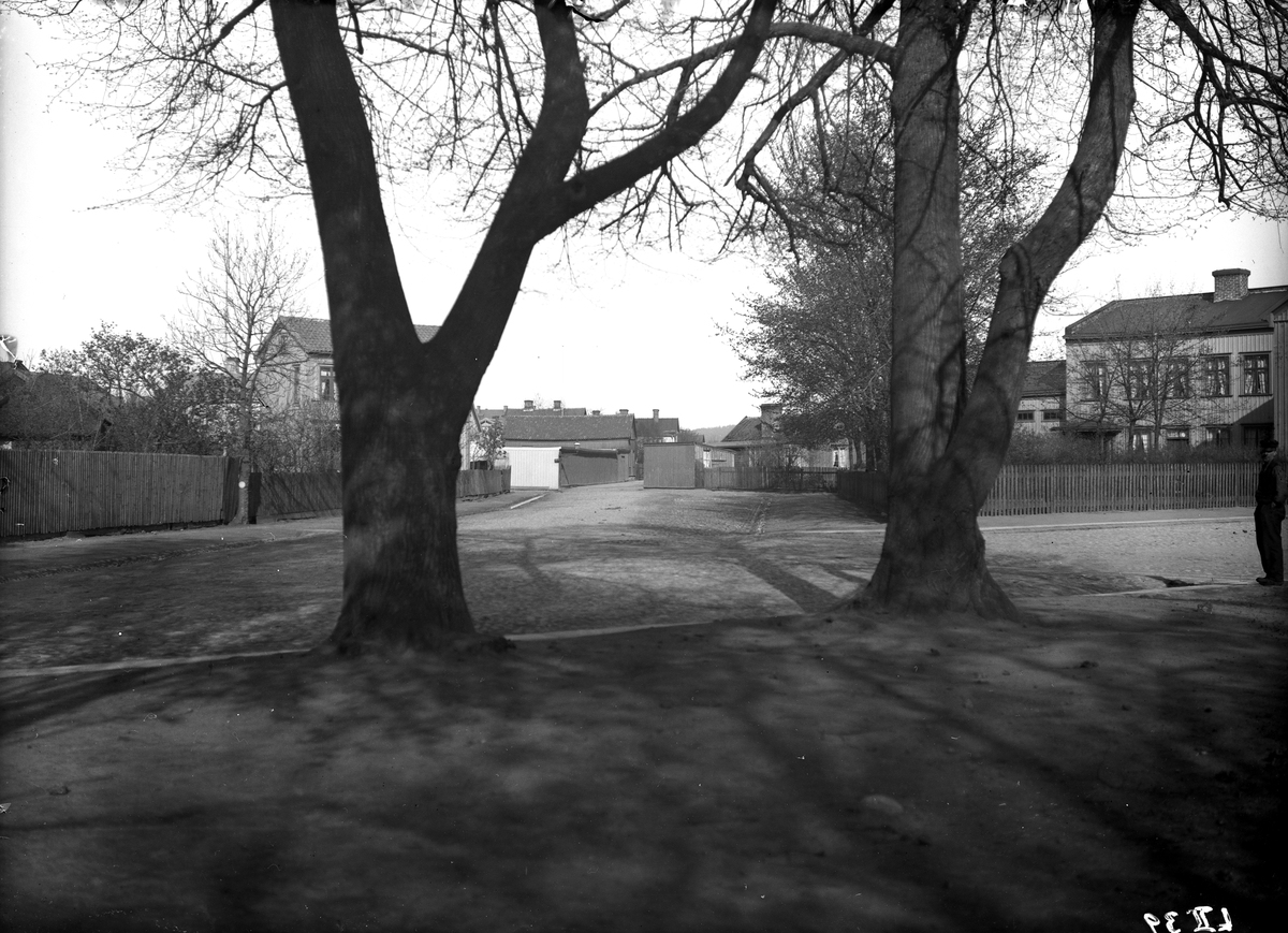 Kålgårdsgatan mot öster från Västra Holmgatan i Jönköping. Rakt fram skymtar Östra Rosenholm med Korva-Lottas affär, som länge hindrade framkomligheten på Kålgårdsgatan.