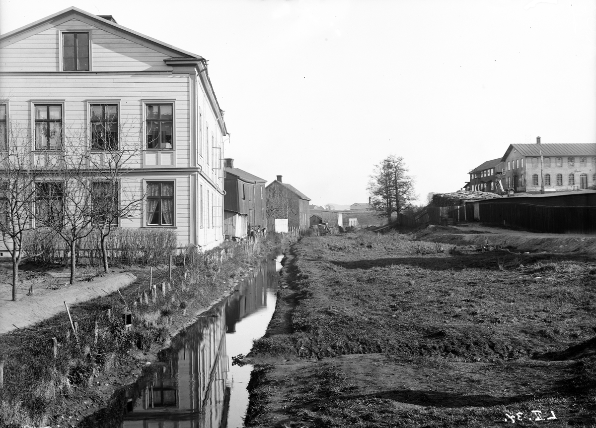 Junebäcken åt söder från Junebro i Jönköping. Bilden är tagen ungefär i nuvarande korsningen mellan Myntgatan och Kristinedalsgatan. Till höger ligger byggnader som tillhörde Junebro Askfabrik. Bostadshuset till vänster hette Junedal.