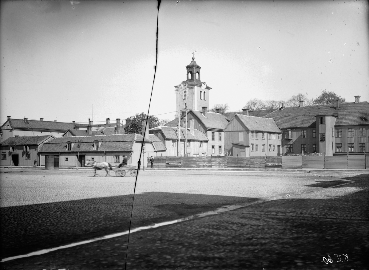Nya torgets norra sida i Jönköping. Kristine kyrkas klocka visar nio på morgonen en vårdag år 1904. Torget anlades då den så kallade Breda hamnen, som var en del av kanalsystemet, fylldes igen på 1830-talet. Planket sattes upp efter en brand i augusti 1903.