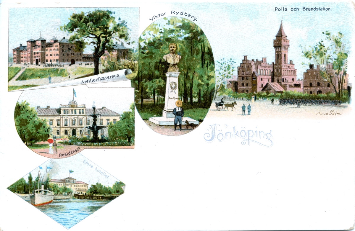 Vykort med Jönköpingsmotiv från Artillerikasernen (A6), Viktor Rydberg (bysten i Rådhusparken), Polis och Brandstationen, Residenset, Stora hotellet.
