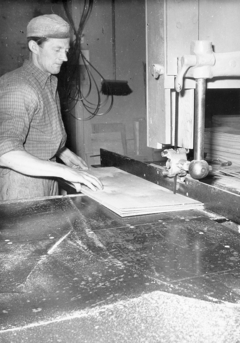 Vid Habo Laggkärlsfabrik på Munkvägen 8, arbetar Evald Skoglund med tillsågning av playwood.