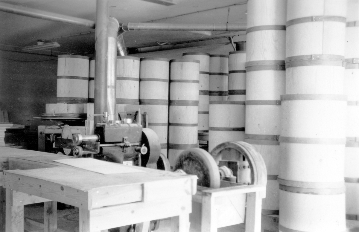 Habo Laggkärlsfabrik. Plywoodtunnor som ska ut på lagret efter tillputsning.