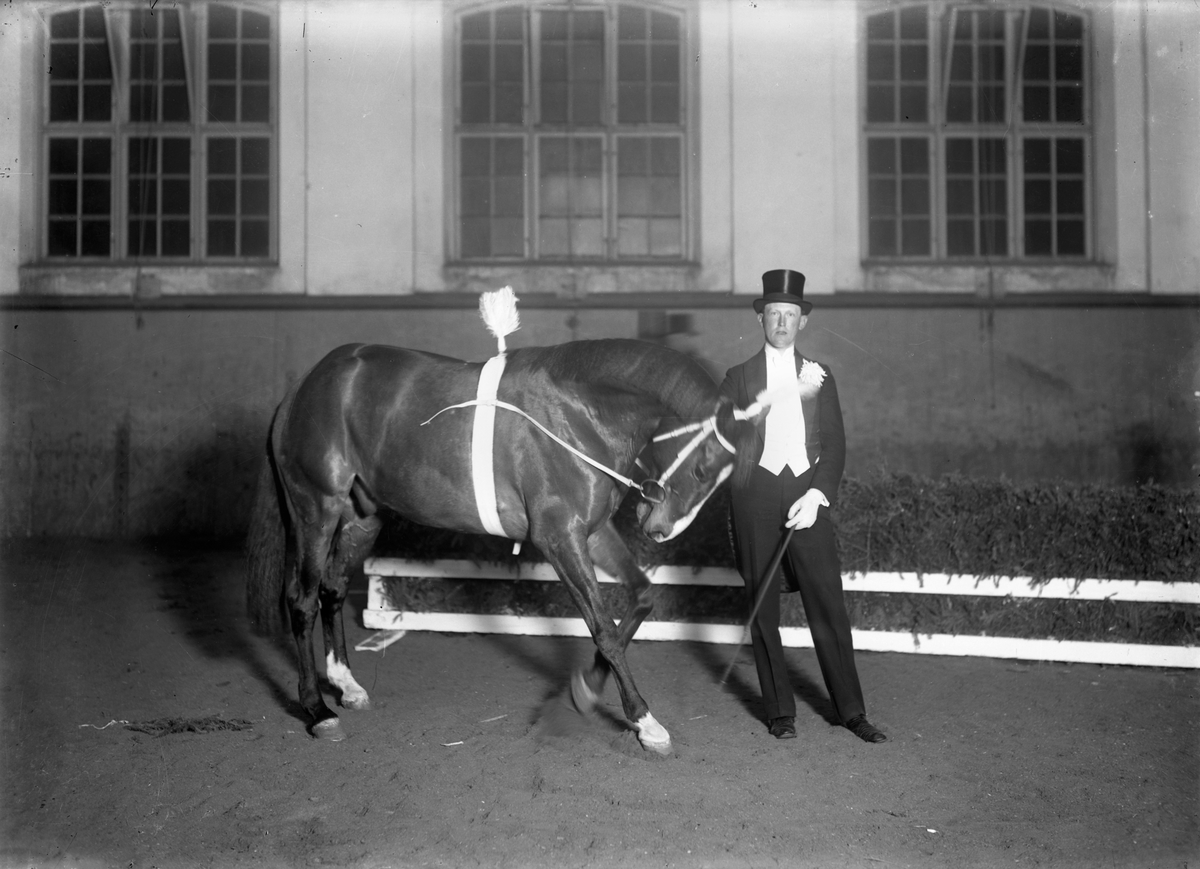 Ryttarfest i ridhuset på Smålands Artilleriregemente, A6. En man i frack och hög hatt med en dekorerad dressyrhäst.