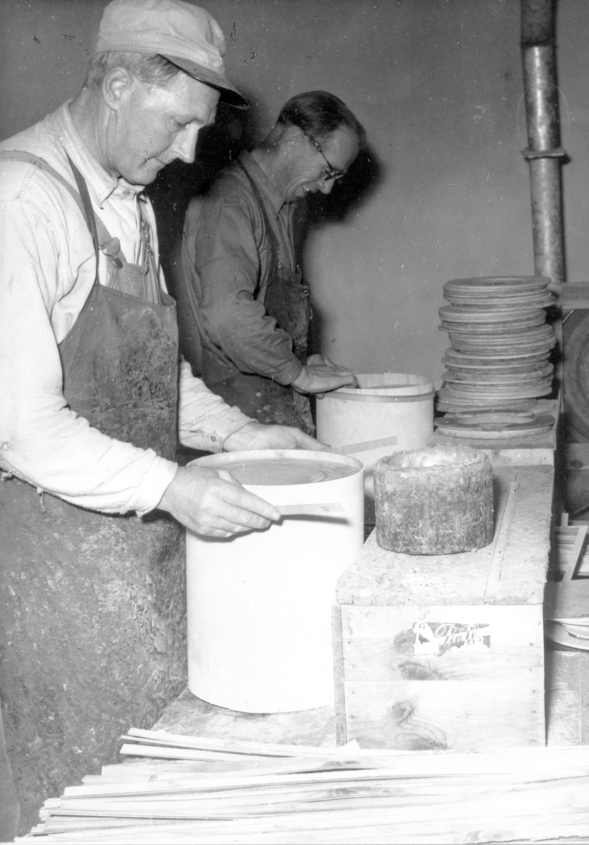 Habo Laggkärlsfabrik. Isättning av lockband på plywoodtunnor av Axel Blom.