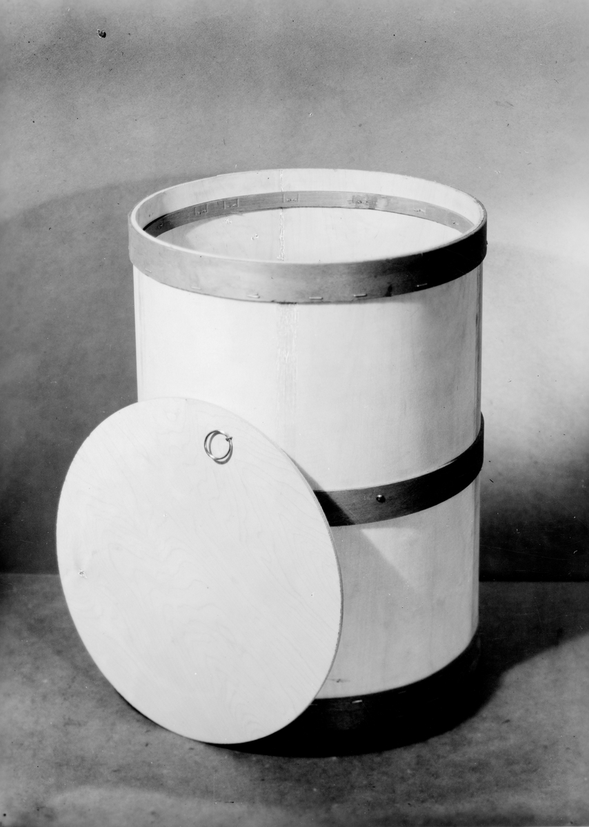 En plywoodtunna med lock från Habo Laggkärlsfabrik.