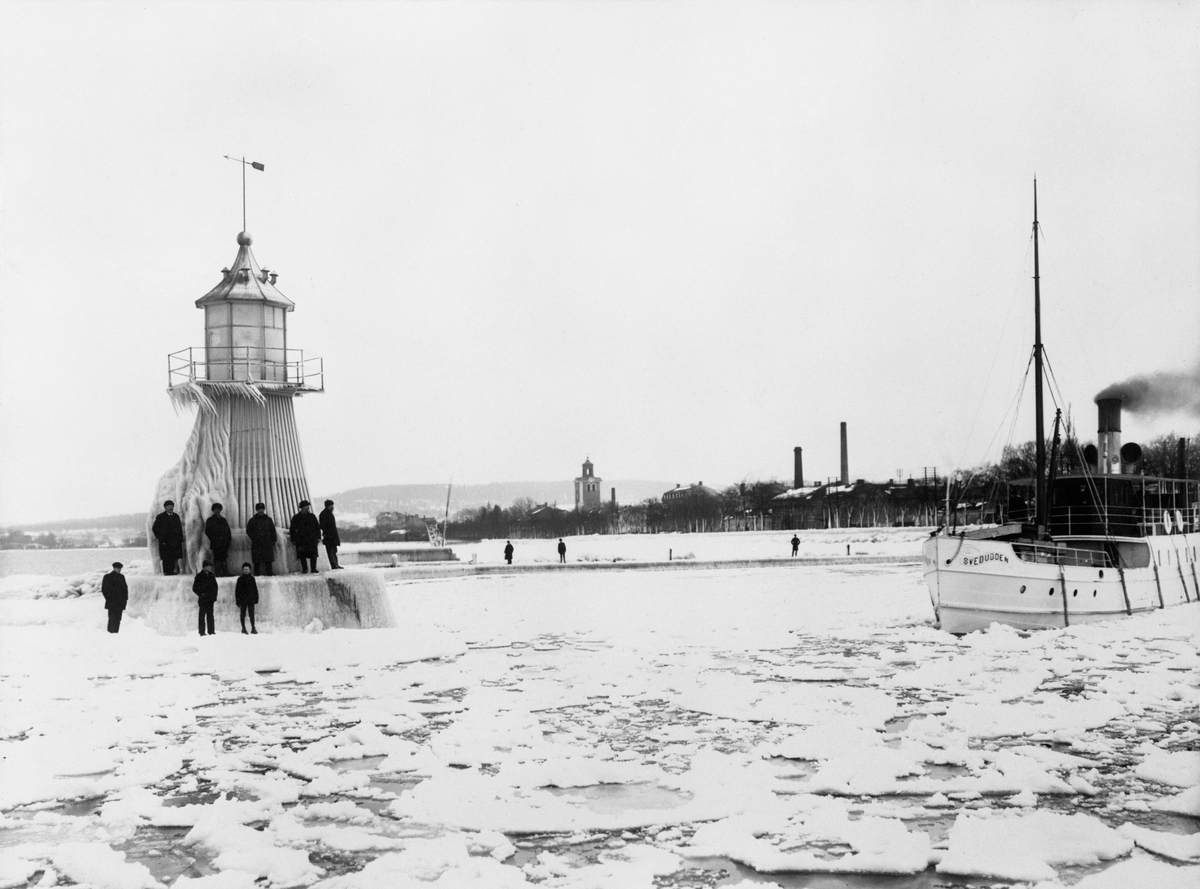 Hamnen i Jönköping vintertid med båten Swedudden. Fyrtornet slopades i samband med östra hamnens ombyggnad år 1914-1915.