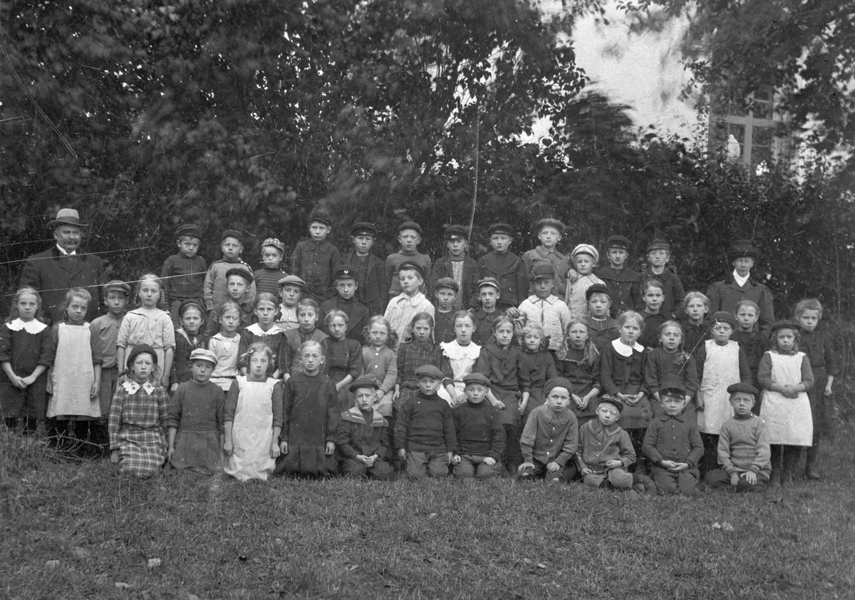 En skolklass år 1910 i Forsheda, med lärarna August och Augusta Karlsson.