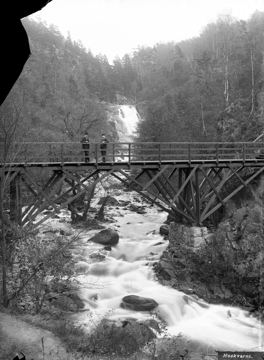 Två män står på en bro vid fallen i Huskvarna.
