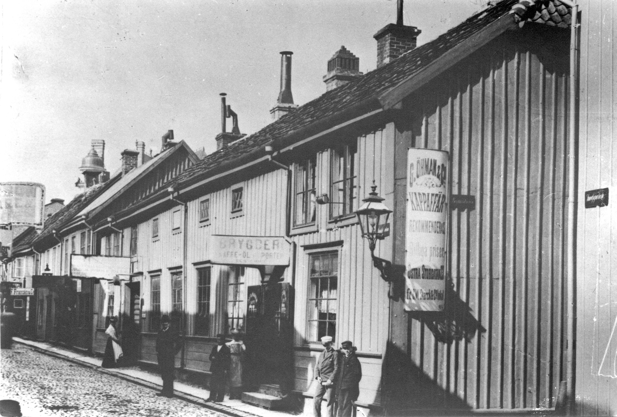 Östra Storgatan i Jönköping. Skylten närmast gör reklam för "G.Öhman & Co, kappaffär, rekommenderas, billiga priser, Östra Storgatan 23". Bredvid ligger ett Bryggeri som serverar Kaffe, Öl och Porter.