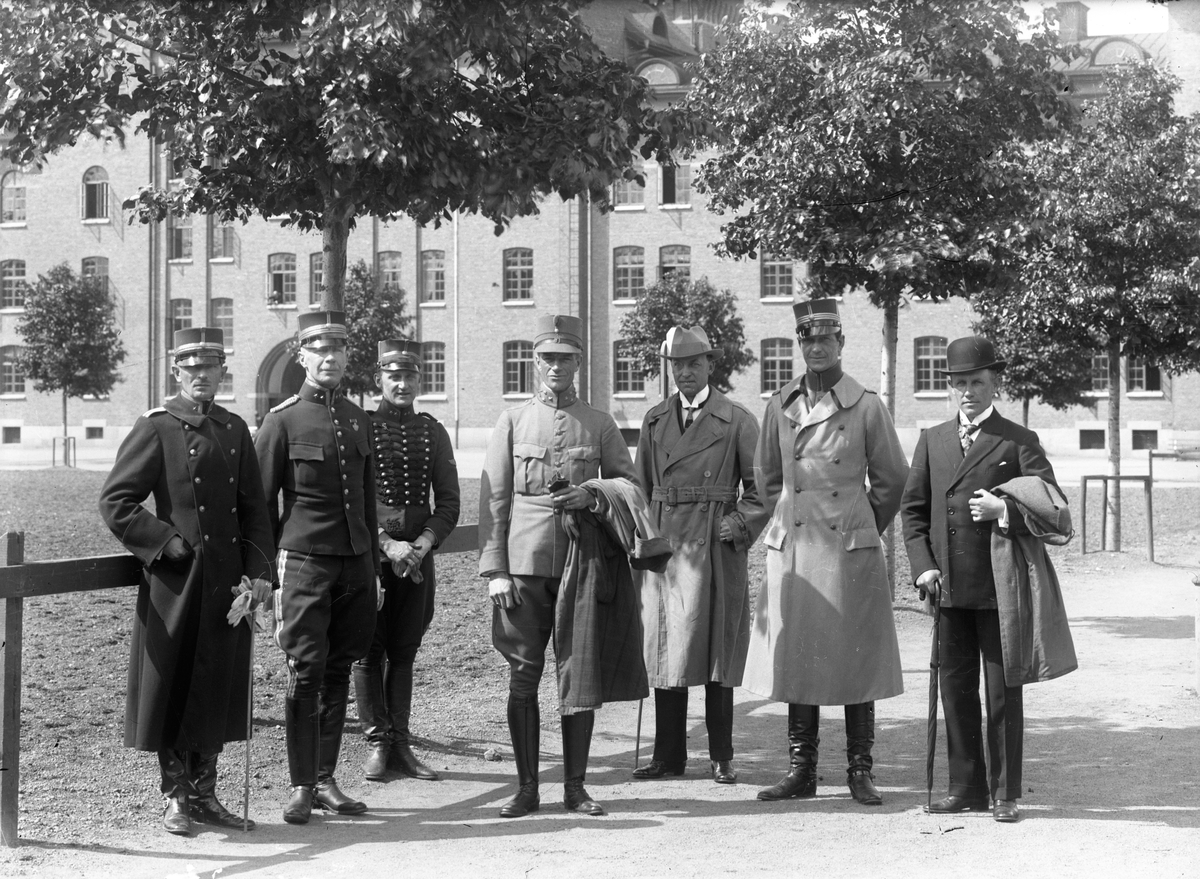Sju män, fem uniformsklädda och två civila, står uppställda vid A6 militärförläggning i Jönköping.