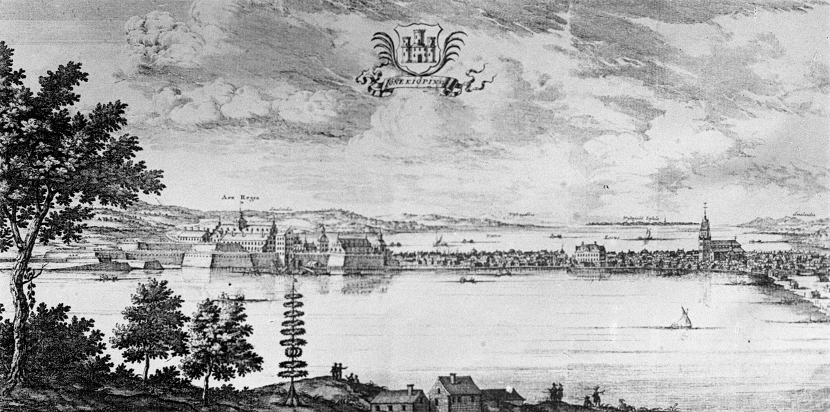 Bild av Eriks Dahlbergs vy över gamla Jönköping tagen från torpet Holmen från öster.