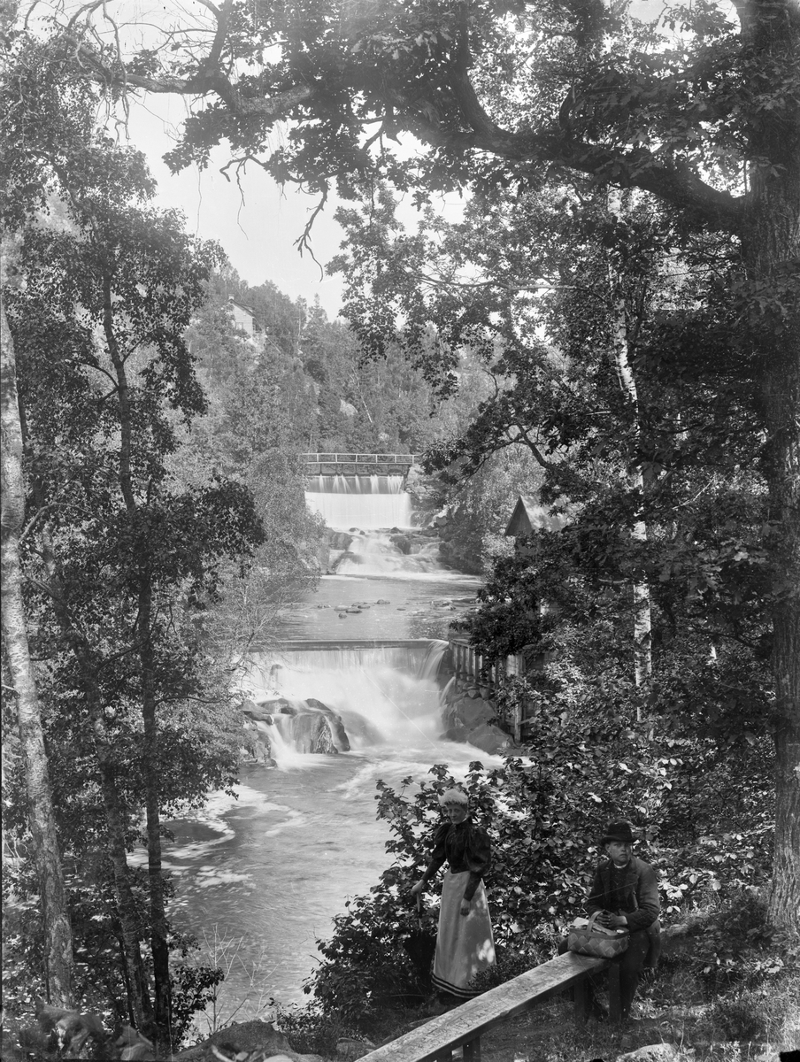 Vid fallen i Huskvarna.En kvinna med parasoll i handen står vid kanten och en yngling sitter på bänken med en korg framför sig.