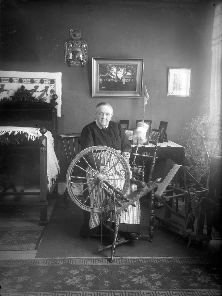 En äldre kvinna sitter vid sin spinnrock. Till vänster står en säng och bakom henne ett bord med en flagga och olika fotografier på. På väggen syns en tavla och en ljuslampett.