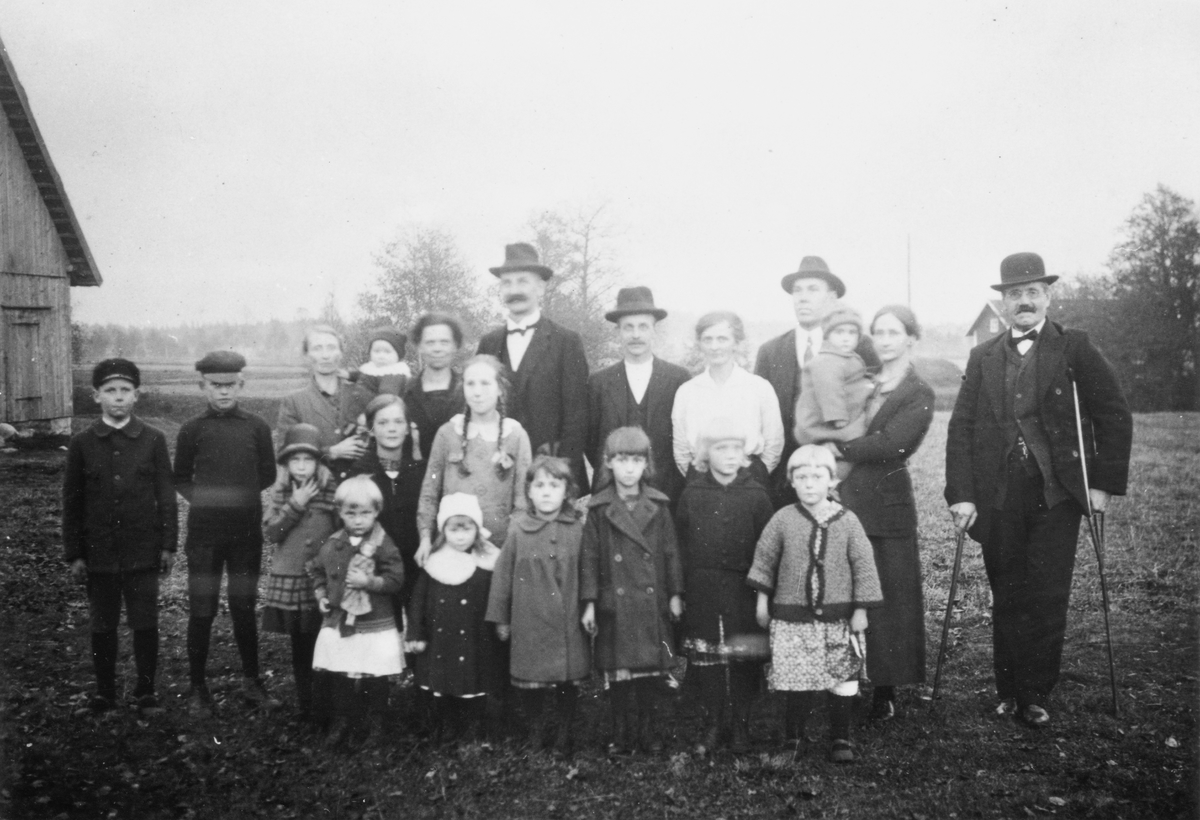 Många gäster har samlats till ett kalas i Sörholmen, Bredaryd. Längst till höger står C J Lundin med kryckor.