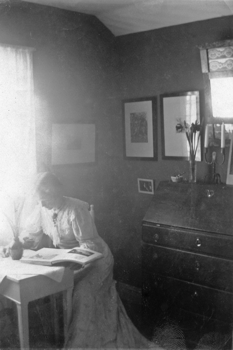 Ester Bauer sitter och läser vid bordet i stugan de hyrde i Torstorp utanför Gränna.