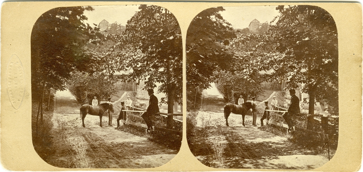 Några män med en häst på vägen fram till kvarnen Jakobsdal nedanför Dunkehalla i Jönköping.