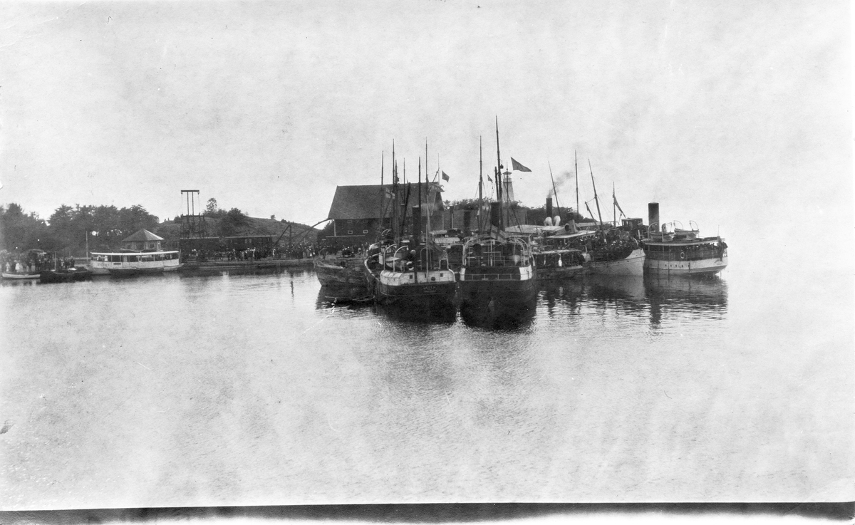 Bärgning av S/S Per Brahe utanför Hästholmen i Vättern. Till vänster ligger ångfartyget Visingsborg-Visingsö och till höger Svedudden.