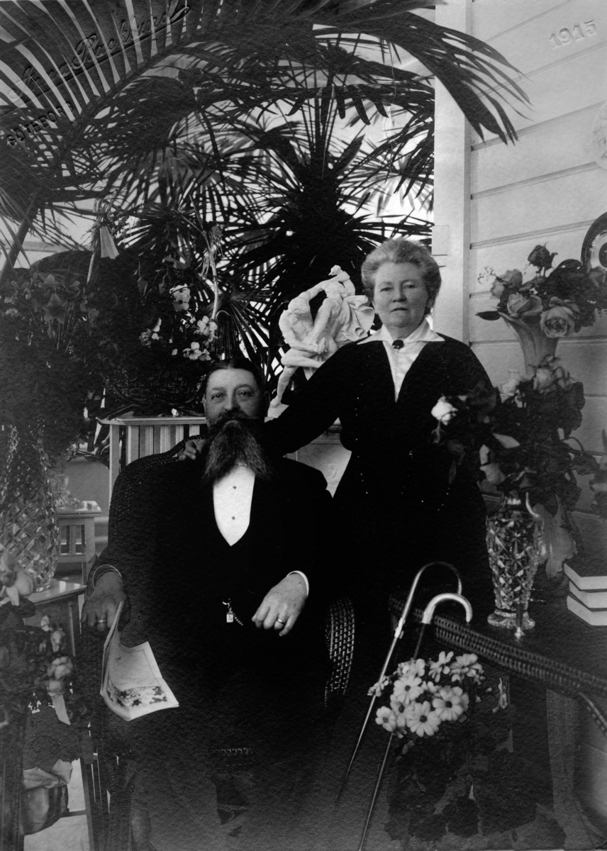 Porträtt av en dam och herre omgivna av vaser med blommor.