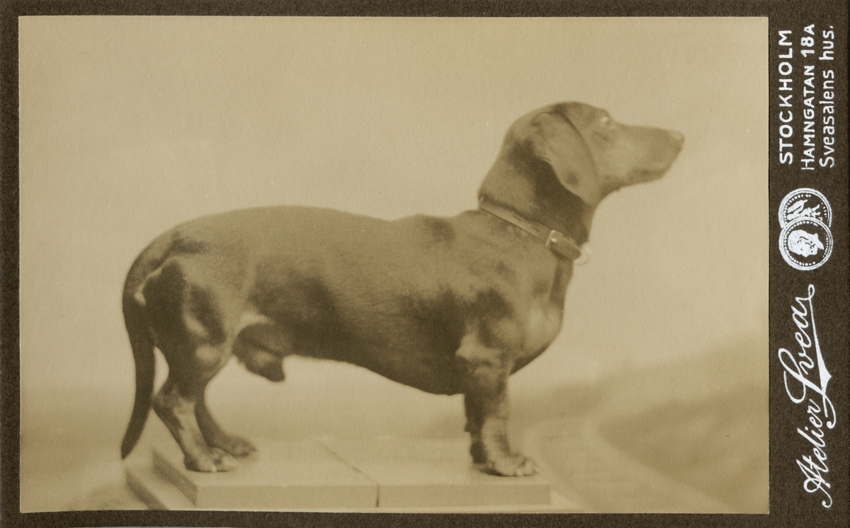 Porträtt av en tax. John Bauer ses ofta på bilder i sällskap med sin hund, en tax.