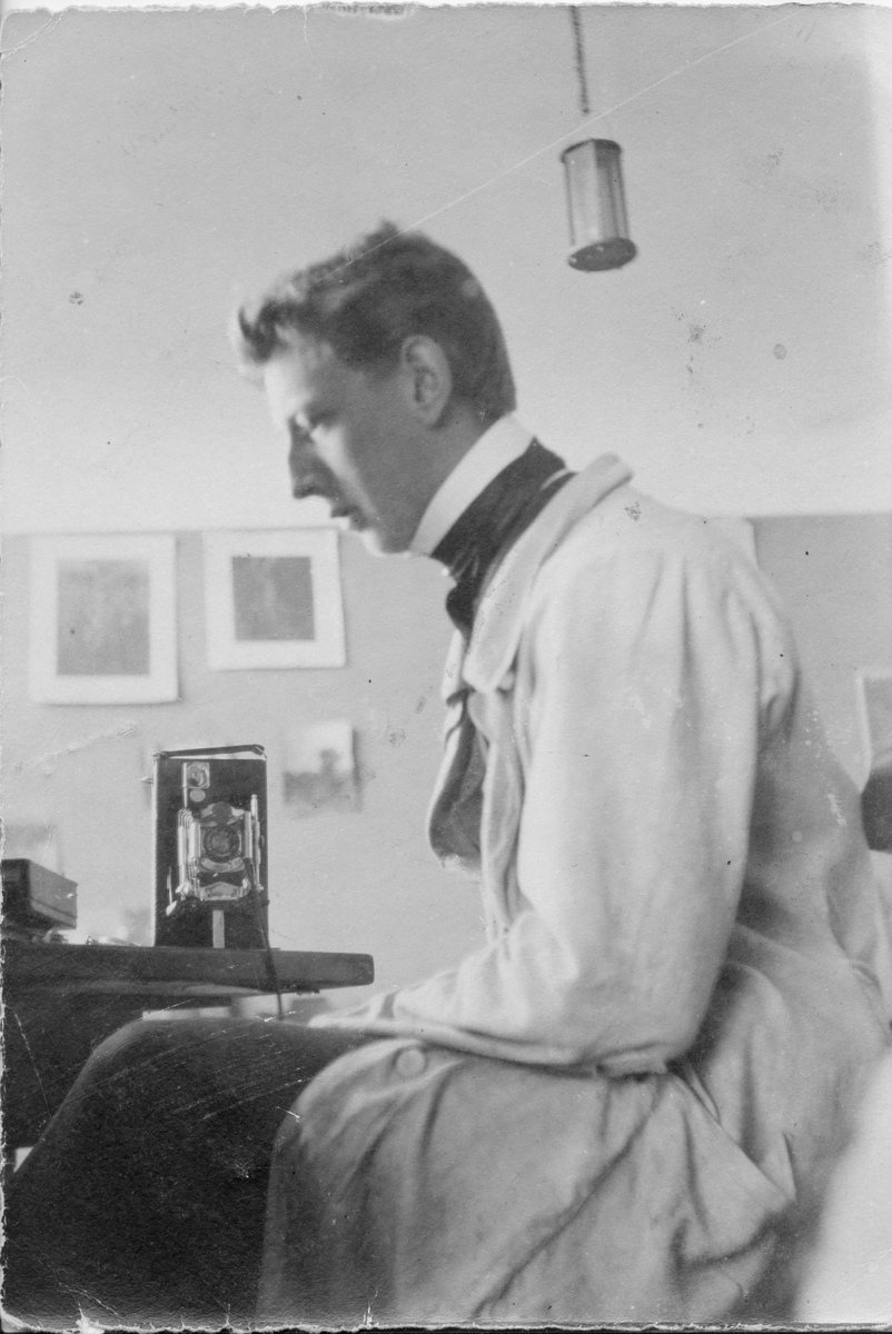 Porträtt av John Bauer i målarrock, med en kamera framför sig på bordet, i ateljén i villa Sjövik, Jönköping.