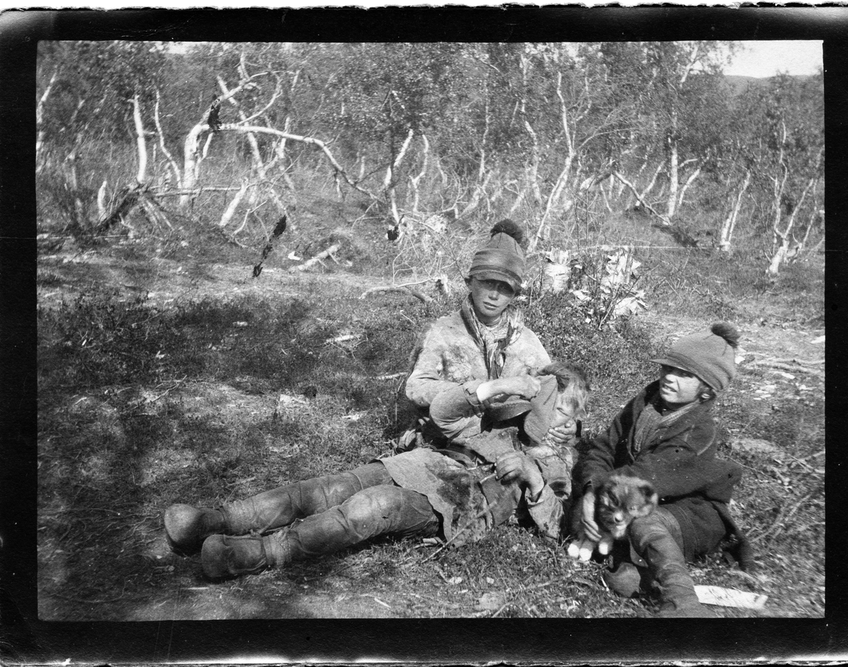 John Bauers Lapplandsresa sommaren 1904. Tre samepojkar och en hundvalp på fjället vid Ripaisenjoki.