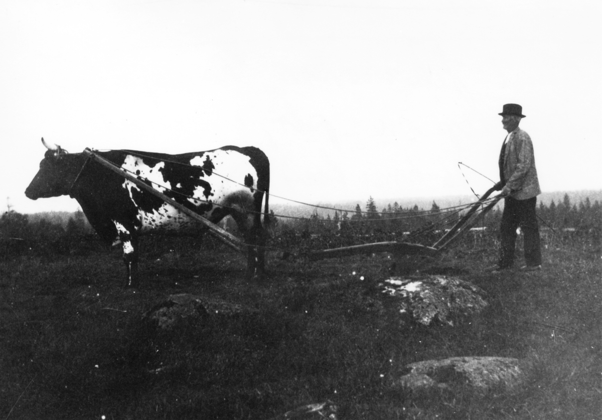 Emil Johansson plöjer med oxe, 16 kvarter, på Ramsjöberg utanför Bor, Värnamo.