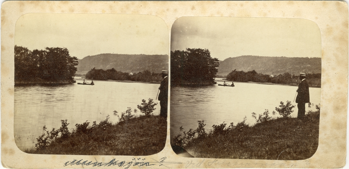 Vid Huskvarnaåns kant står en man och tittar på två män i en båt.