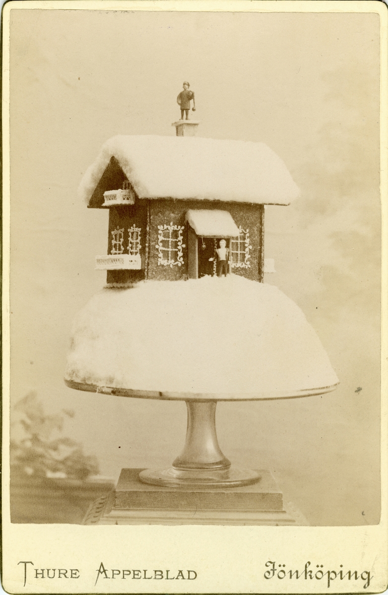 Ett hus gjort som en "Schweizerhydda" av konditor Arvid Östberg till B Sandvalls bröllop 1889-01-04.
