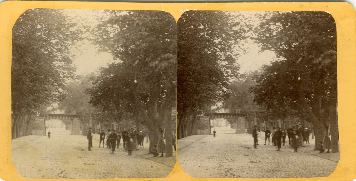 Östra Storgatan med Järnvägsbron i Jönköping. Bilden är tagen mitt för Östra folkskolan.