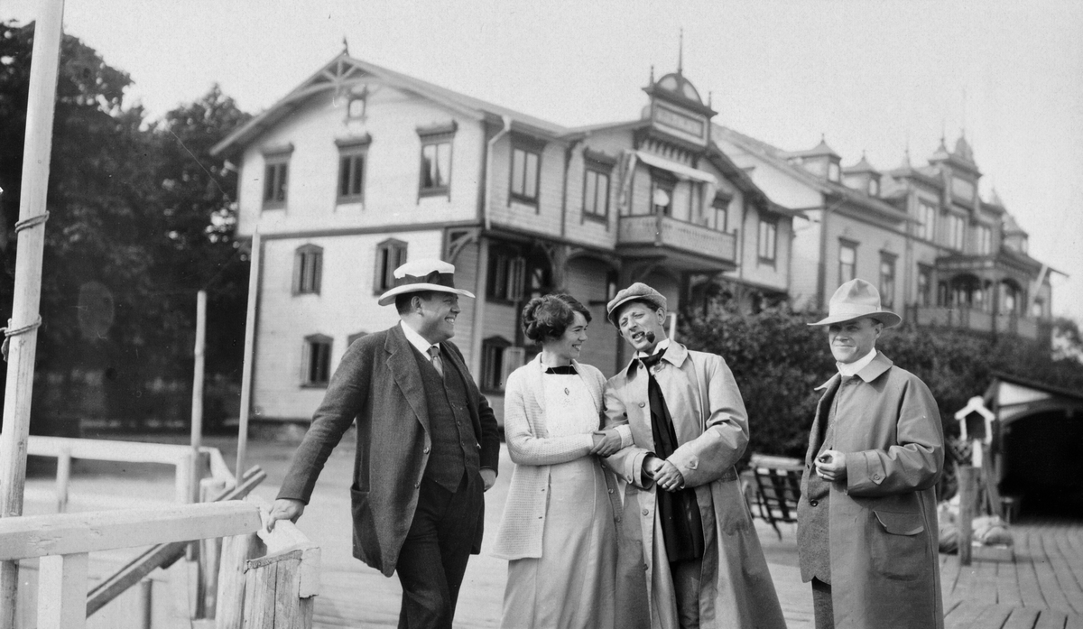 John Bauer tillsammans med en kvinna och två män framför två stora trähus.