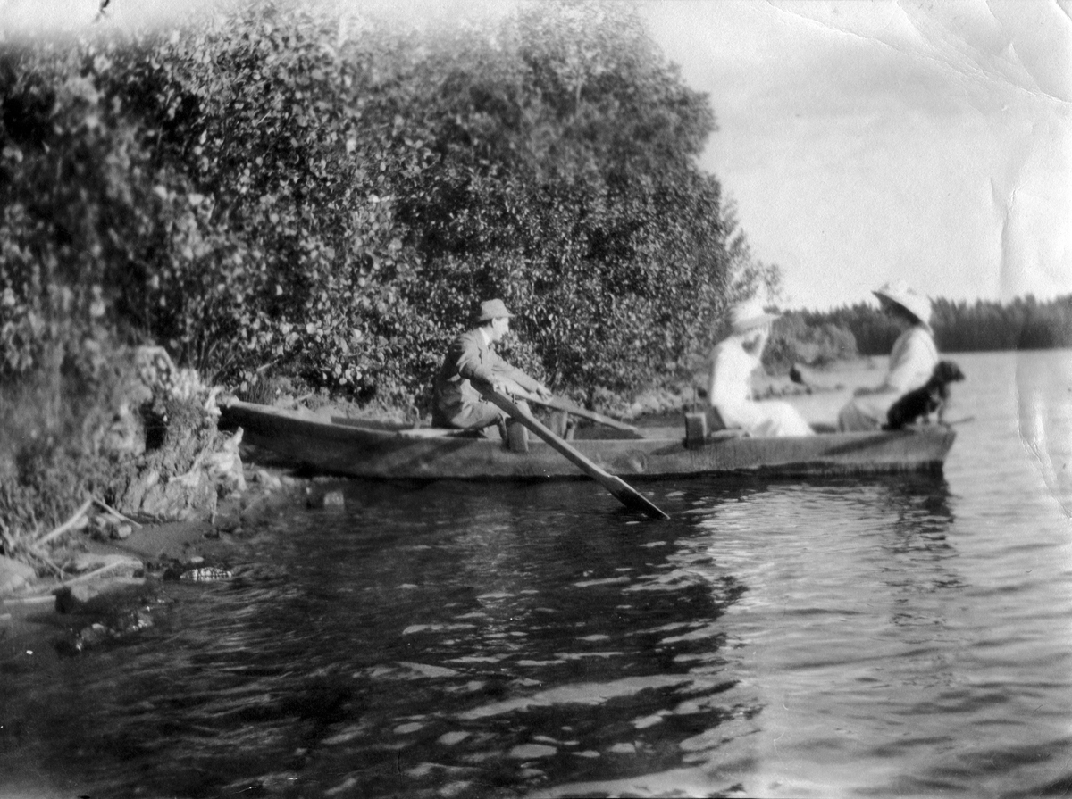 I en eka sitter John Bauer vid årorna tillsammans med Ester, deras hund och en ung kvinna.