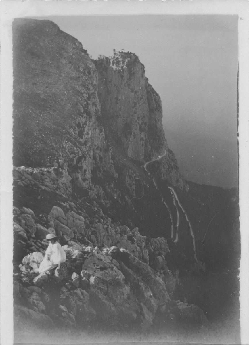 Ester Ellqvist sitter på en klippa på Capri i Italien. Den slingrande vägen i bakgrunden leder upp till Anacapri med Barbarossas borg på klippspetsen.