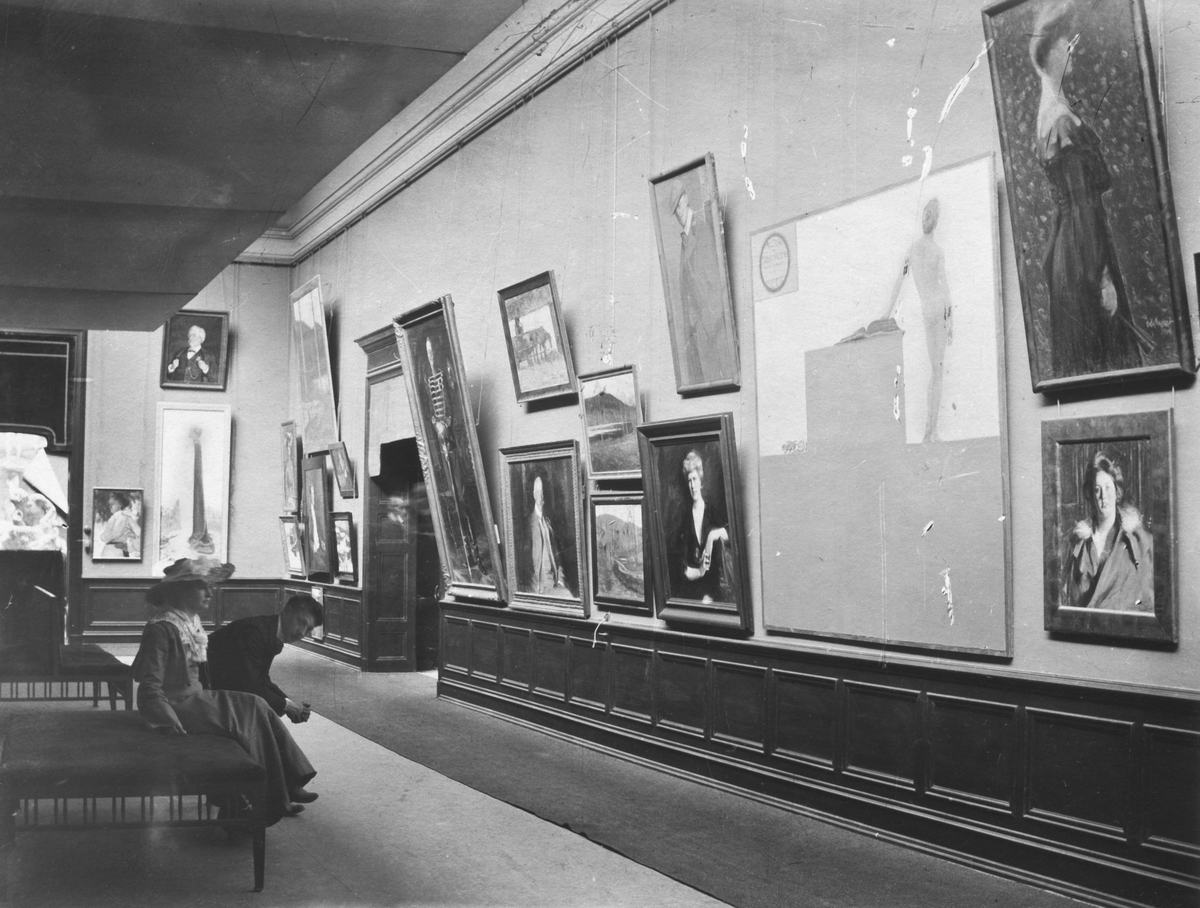 John och Ester Bauer sitter på en bänk och studerar tavlorna vid utställningen av svensk konst i Köpenhamn år 1918.