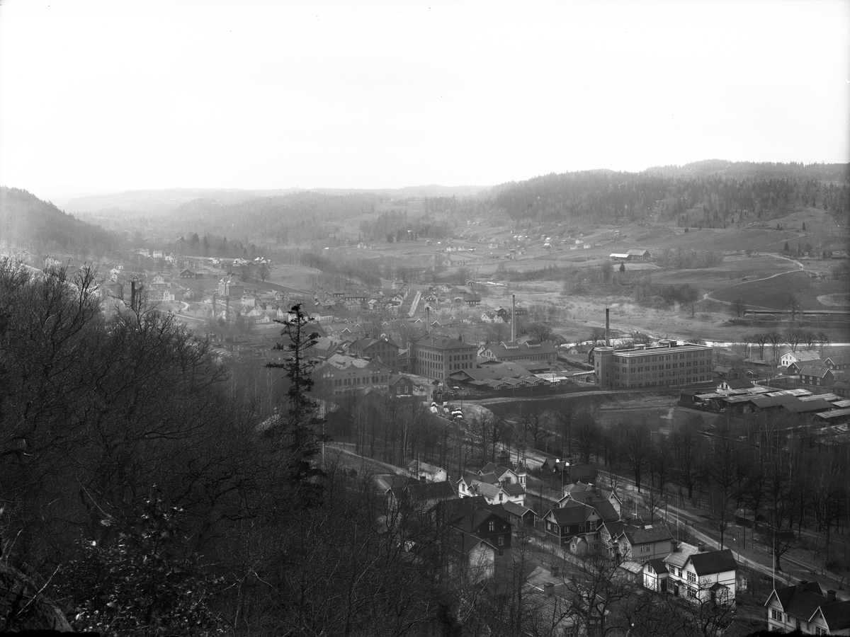 Vy över Huskvarnadalen söderut med Husqvarna fabriken år 1908.