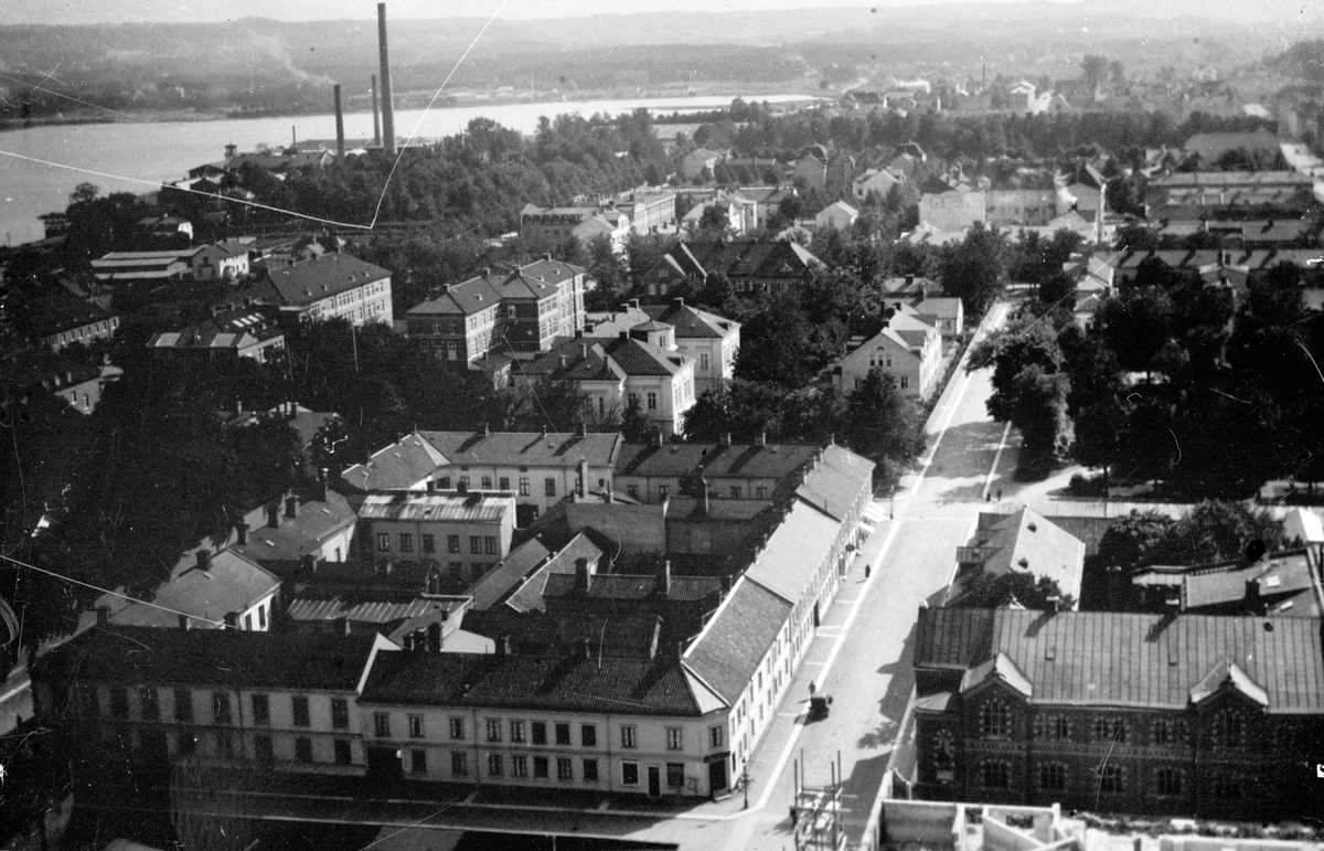 Utsikt över västra stadsdelen i Jönköping med Munksjön till vänster. I mitten går Fabriksgatan och till höger ligger gamla Immanuelskyrkan.