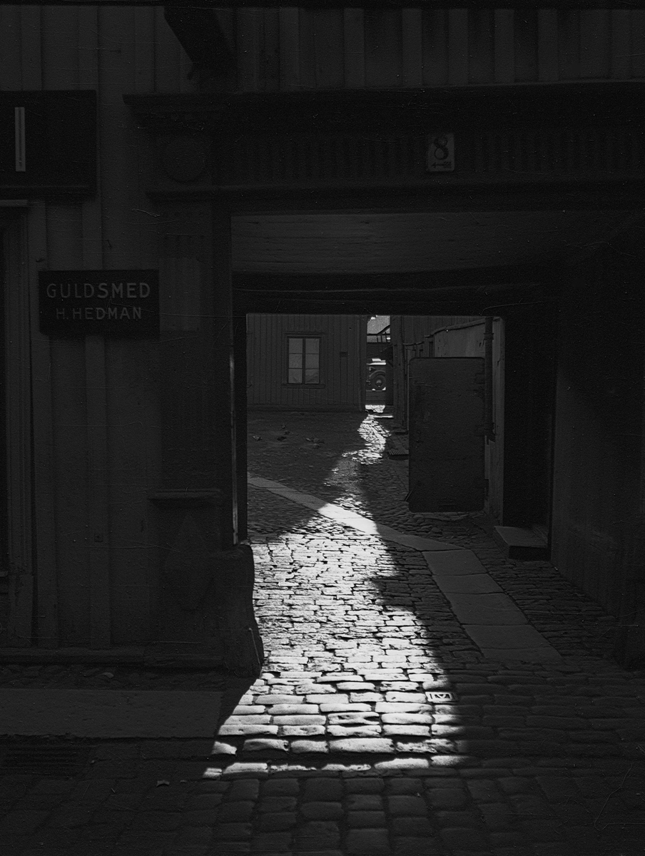 Port in till gårdsplan vid Smedjegatan 8 i Jönköping. Till vänster om porten sitter en skylt med texten: Guldsmed Hedman.
