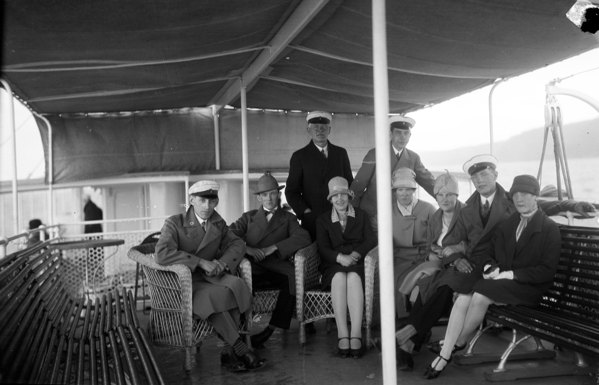 Nio personer på båten "Motala Express" vid en färd på Vättern.