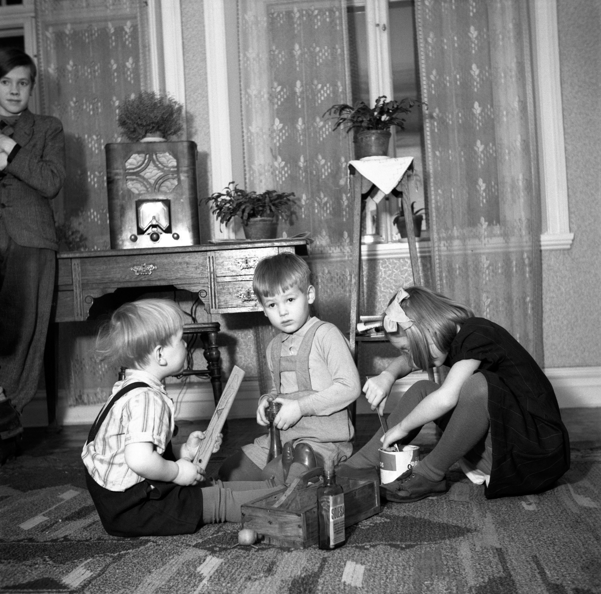 Från vänster syns syskonen Åke, Knut, Kenneth och Britt Andersson i en lägenhet på Kapellgatan 6 i Jönköping.