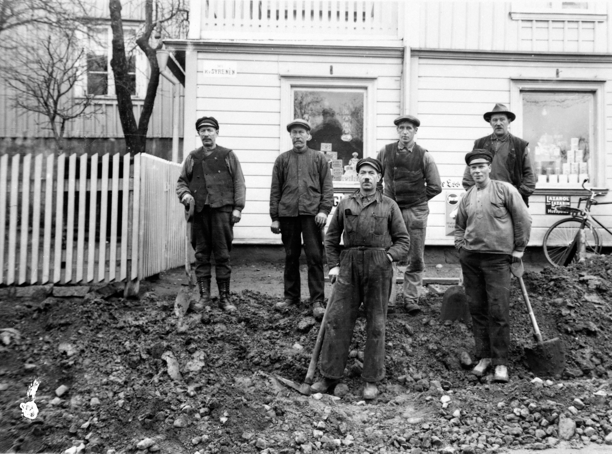 Gatuarbetare utanför Ernst och Ingrid Skogs livsmedelsaffär på Björnebergsvägen i Jönköping. Överst till höger står Emanuel, kommunalarbetare och nederst till höger Ivan Åsberg.