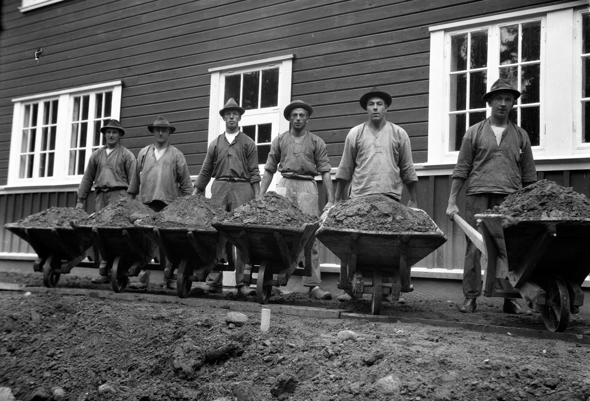 Sex män på rad med skottkärror lastade med grus framför ett hus i Jönköping.