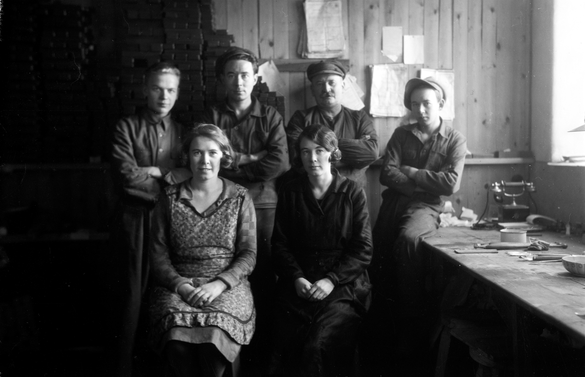 Fyra män och två kvinnor bredvid ett bord, där det finns en telefon och några skärverktyg.