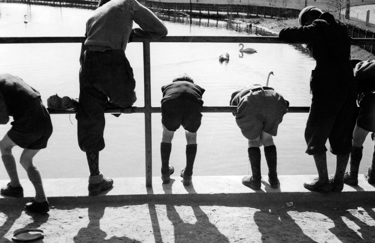Några pojkar hänger över räcket vid kanalen troligen mellan Vättern och Rocksjön.