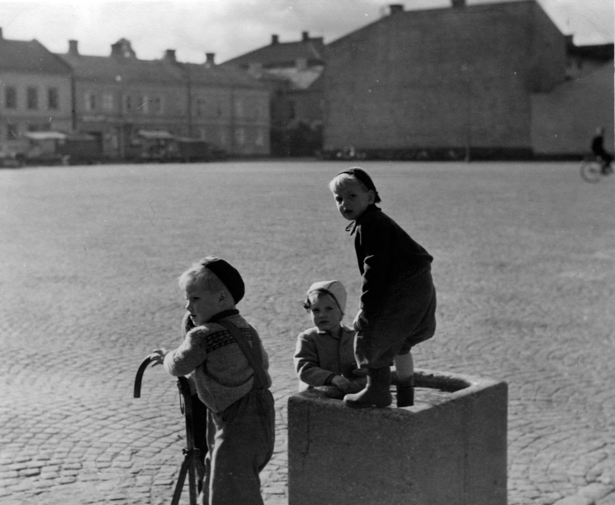 Några barn leker vid vattenposten på Västra torget i Jönköping. I bakgrunden syns gaveln på gamla samrealskolan.