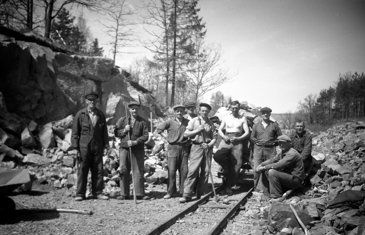 Järnvägsarbetare vid Ulricehamnsbanan utanför Jönköping. Järnvägen byggdes som ett beredskapsarbete under en lång tid. Sträckan Ulricehamn-Jönköping blev färdigbyggd och öppnad för trafik den 1 mars 1940.
