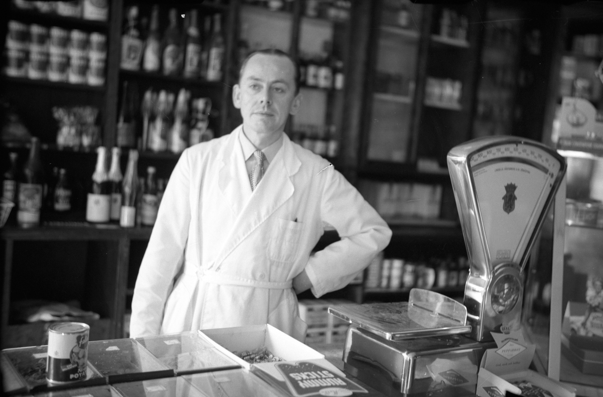 Olle Wahlgren, vid disken bredvid vågen, i Wahlgrens affär på Västra Storgatan i Jönköping.