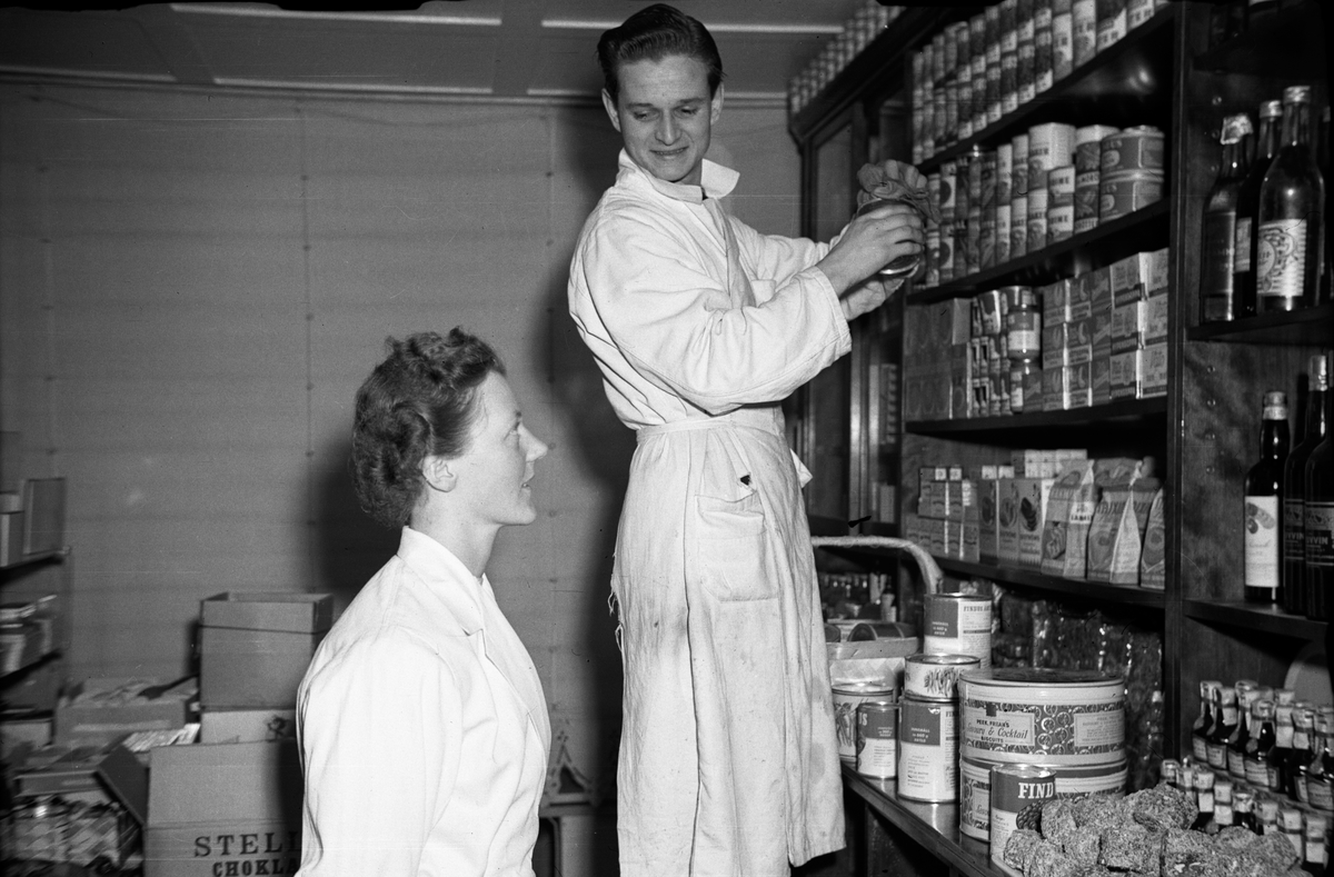Vivian Andersson och Olle Wahlgren i Wahlgrens speceriaffär på Västra Storgatan i Jönköping.