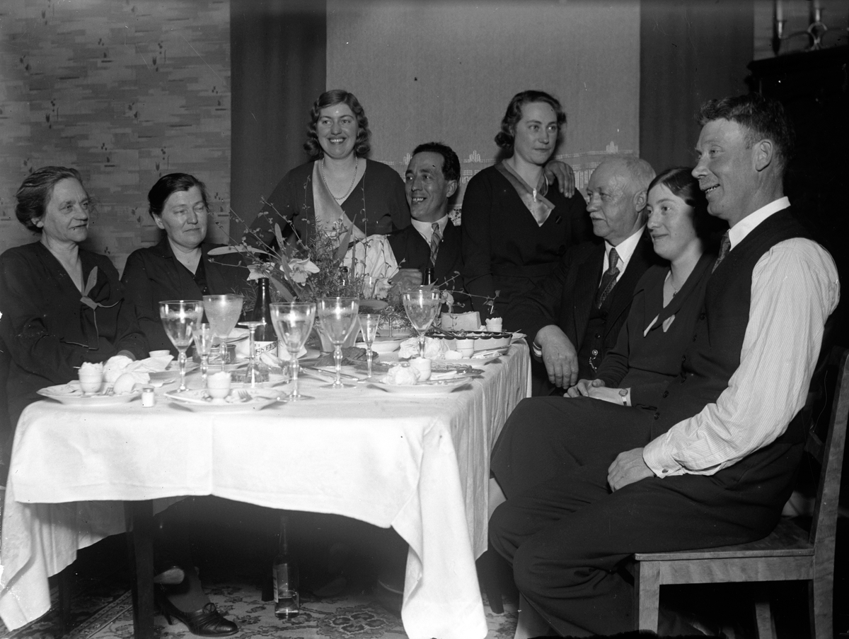 Kvinnor och män sitter kring ett dukat bord, kanske vid påsk. Där står en vas med påskliljor och gönt. Det är dukat med tallrikar, äggkoppar och glas för pilsner och snaps.