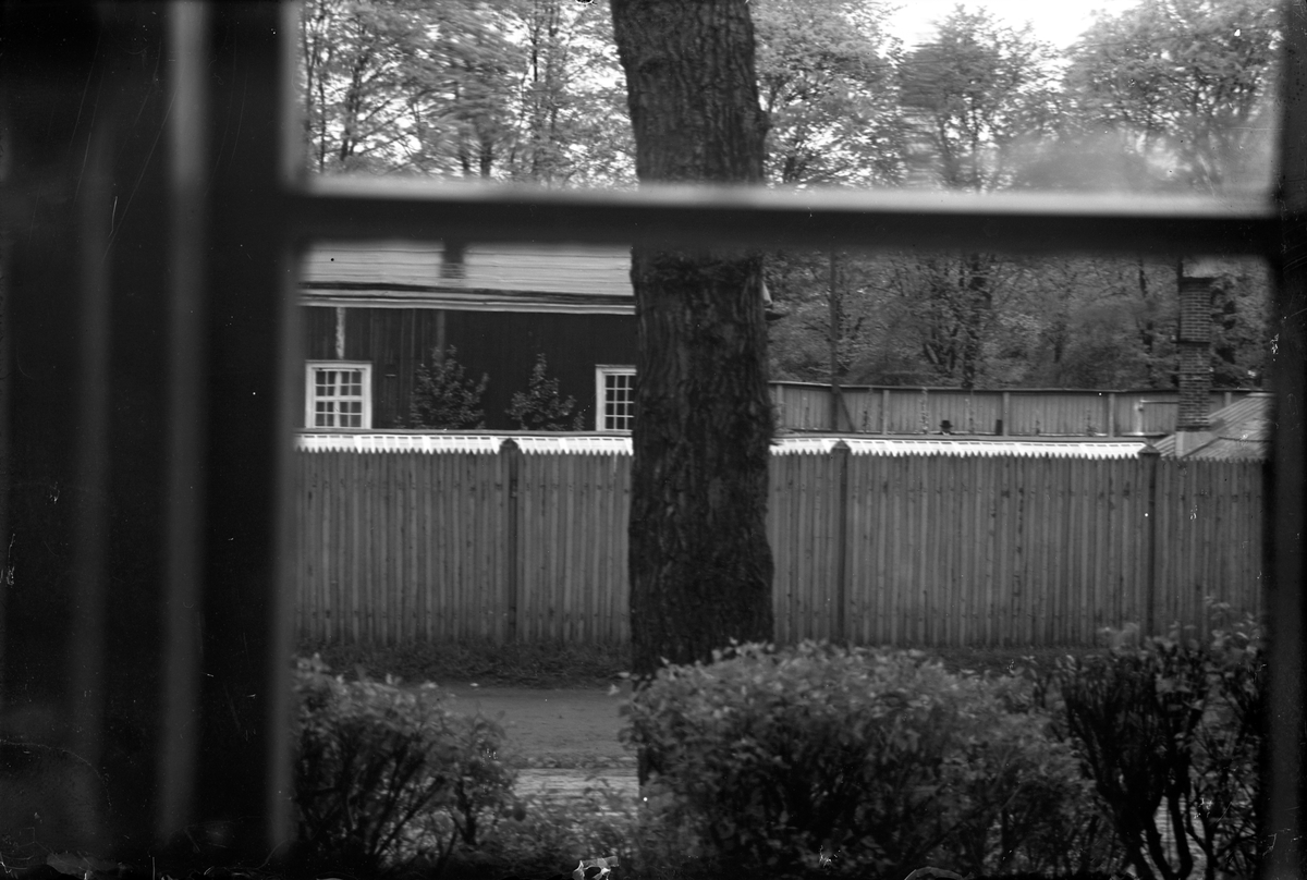 Genom fönstret ser man en staketomgärdad tomt och en del av ett hus.